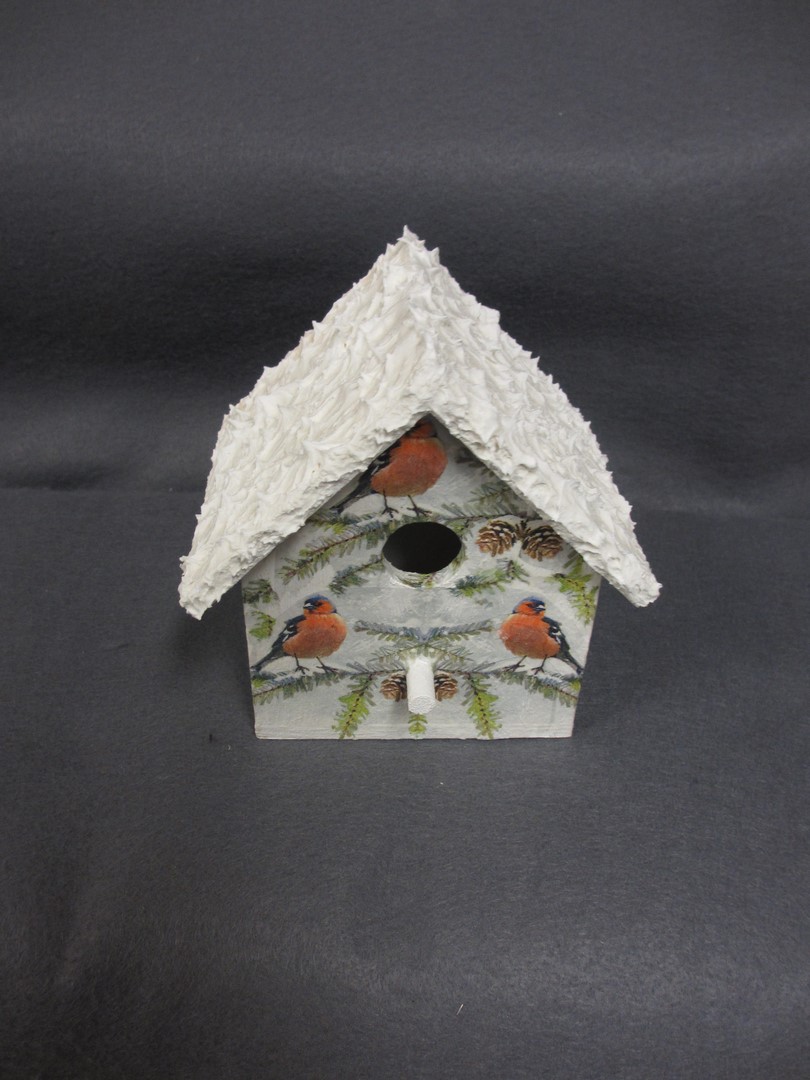 Allar hliðar skreyttar með fuglamyndum, snjór á þaki